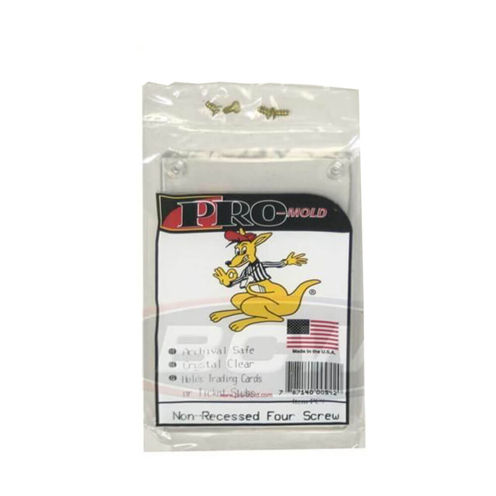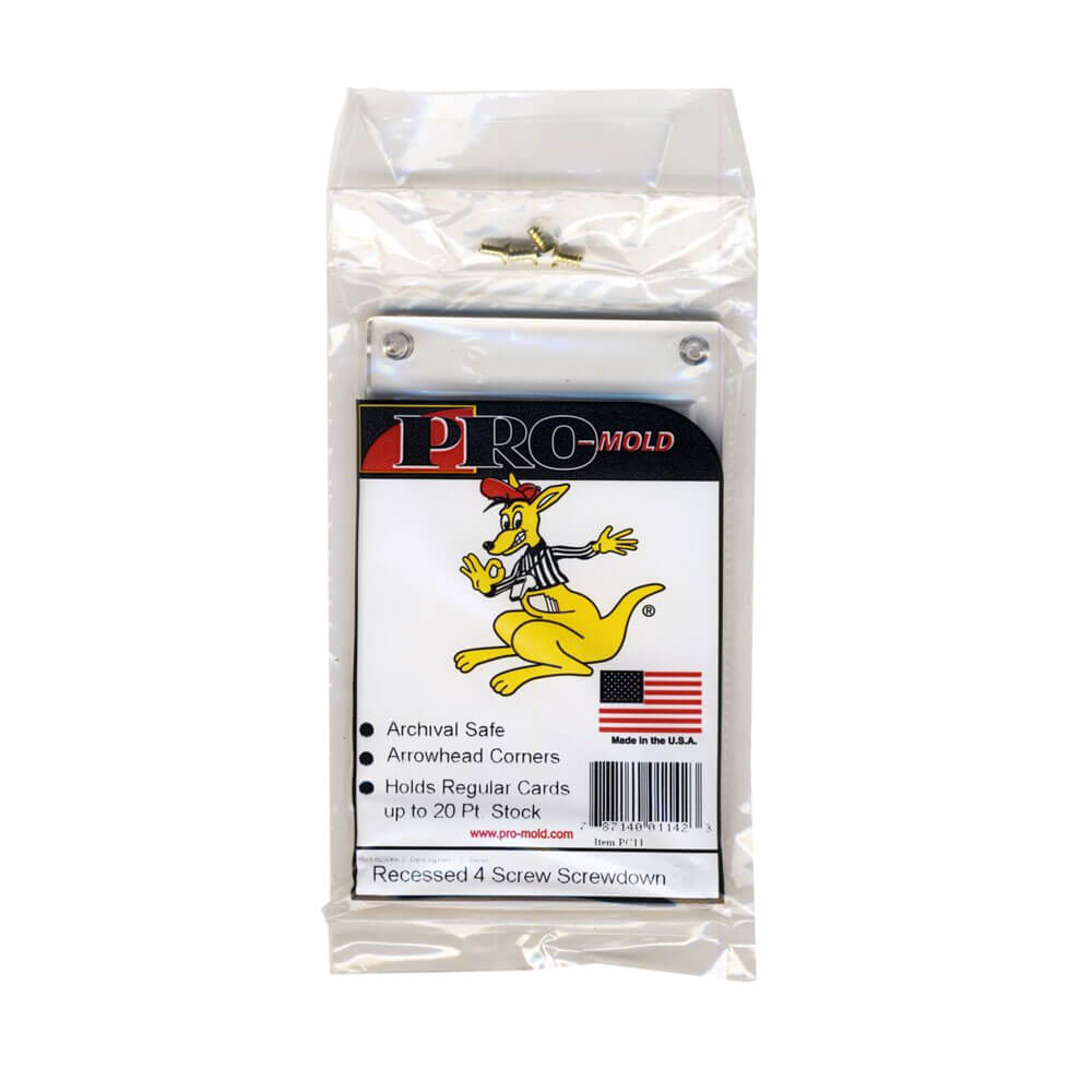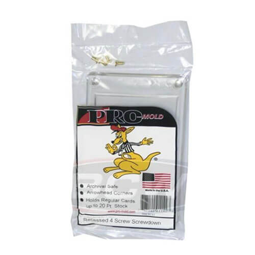 The Pro-Mold 4-Screw Holder Is designed to attractively display one card. Unlike other 4 screw screw downs, this one has a recessed area on the lid above the card that gives the card a three dimensional look. This holder has inter-locking screw holes that make it stackable.