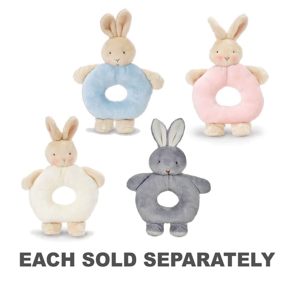 - Adorable in pastel pink, blue and white are sweet little bunny rattles that baby will shake with glee!