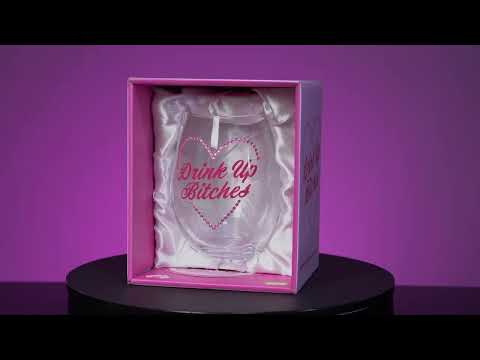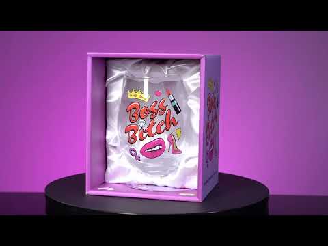 Sip your wine from this glass like the boss b*tch you are! Hand-blown stemless glass featuring bold, pop art-style femme icons. Bubble red text reads 'Boss Bitch'