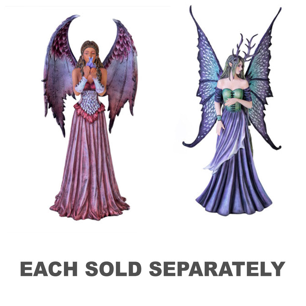 Figurine of an elegant purple fairy gazing lovingly at a baby dragon. She wears a corset adorned with feathers and a flowing purple dress to match her glittery purple wings. Detailed sculpting and paintwork with lifelike textures.