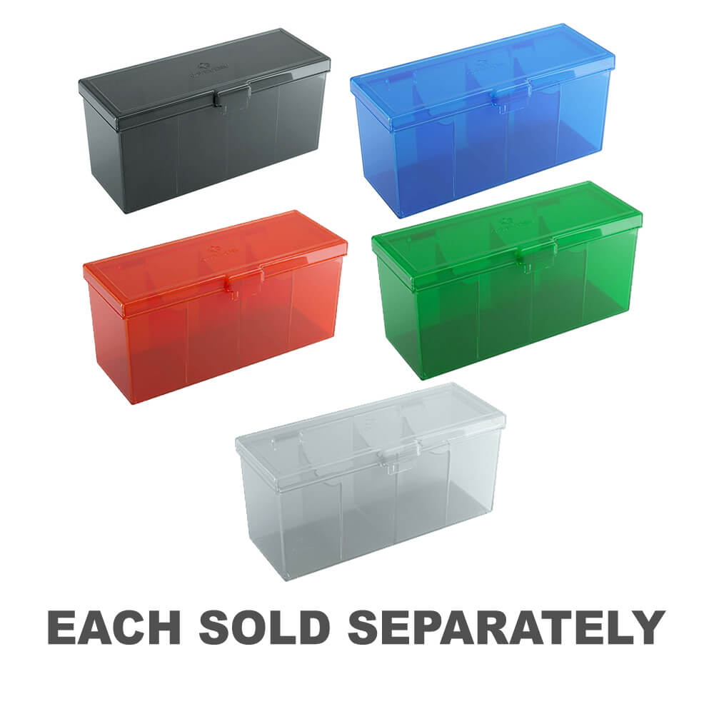 Full decks, dice, tokens or 320 double-sleeved cards: there is a lot that the Fourtress can hold and protect! This sturdy box is available in 5 different semi-transparent colors, allowing its contents to be easily identified. The integrated lock keeps it safely closed, while two inner walls can be removed to create bigger compartments. The boxes are stackable, so they are both perfect travel companions and a great storage solution at home.
