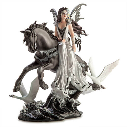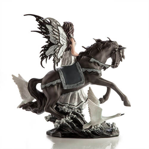 - Sits atop a majestic black stallion galloping through black waves; while white swans take flight