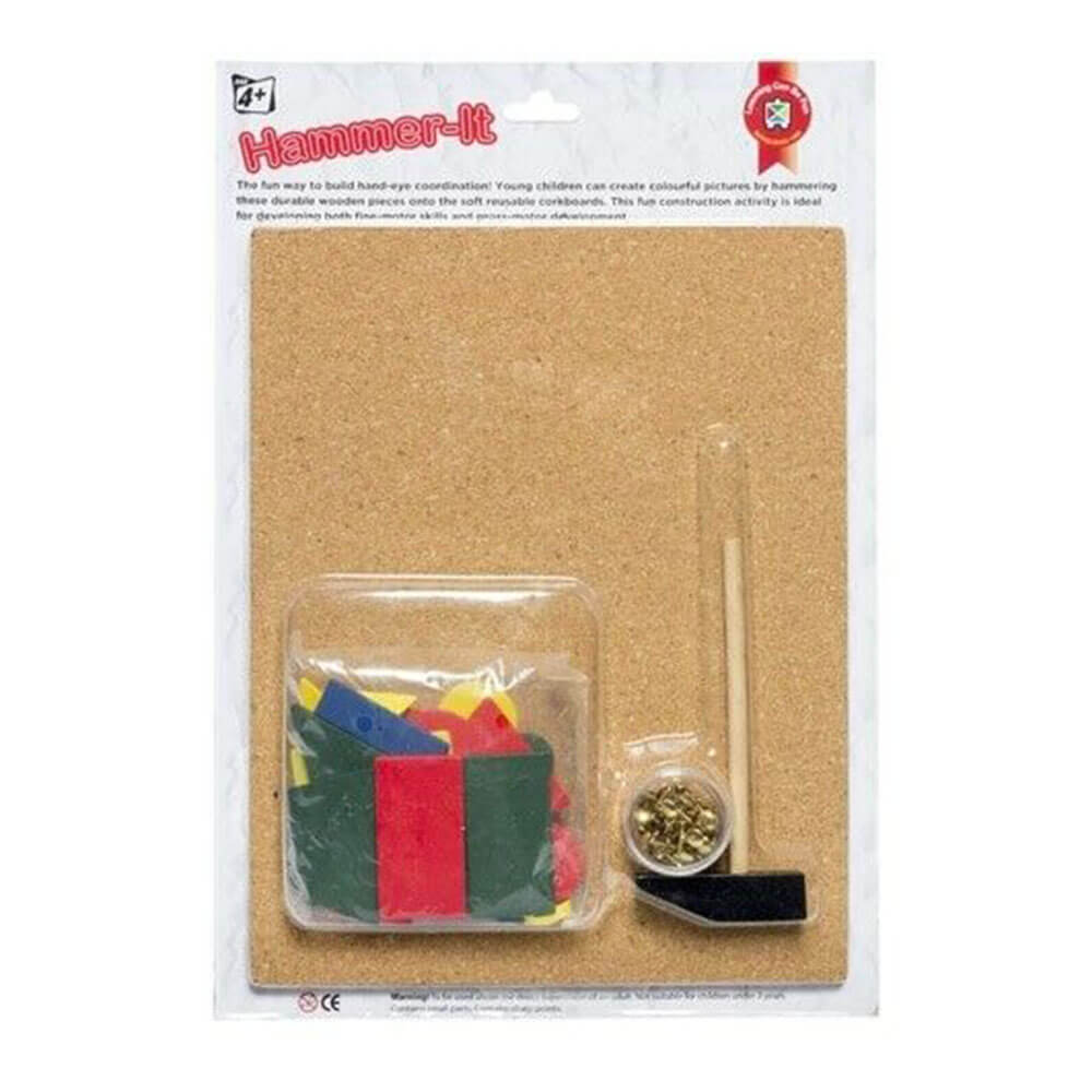 Young children can create colourful pictures by hammering these vibrantly coloured wooden pieces onto the soft reusable corkboards.