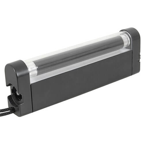 This will not fill a darkened party room with white glowing teeth. It works well in a small space, however. Includes a small spot light and hand carry strap. Fun when camping etc. UV tube is 4 watt rated.