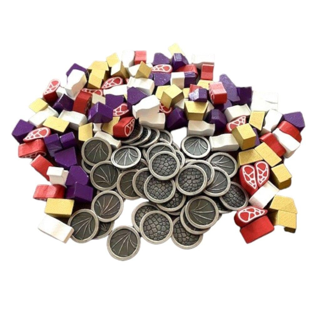 These 45 metal coins and 104 wooden resource tokens were designed specifically for Wyrmspan (the game includes cardboard tokens). All metal coins are identical, and there are 26 each of the resource tokens: meat, gem, gold, and milk.