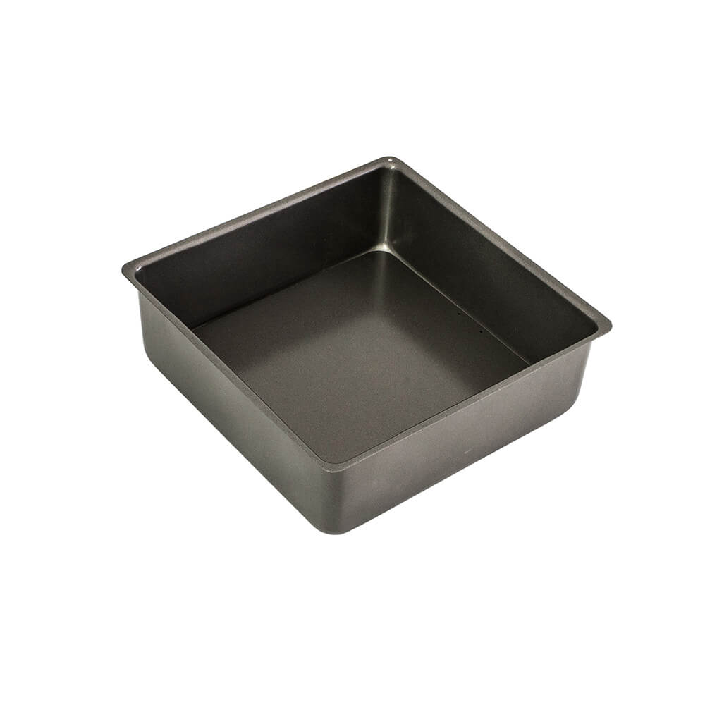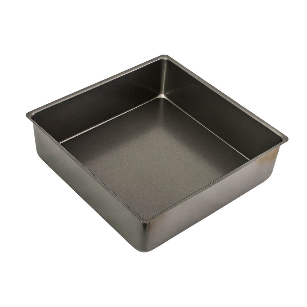 Eine hochwertige, quadratische Dose, ideal für die Herstellung von Geburtstagskuchen oder Weihnachts-Obstkuchen!-Kuchen!. Hergestellt aus robustem Kohlenstoffstahl mit hochwertiger Quantum2-Antihaftbeschichtung und loser Basis zum einfachen Lösen.