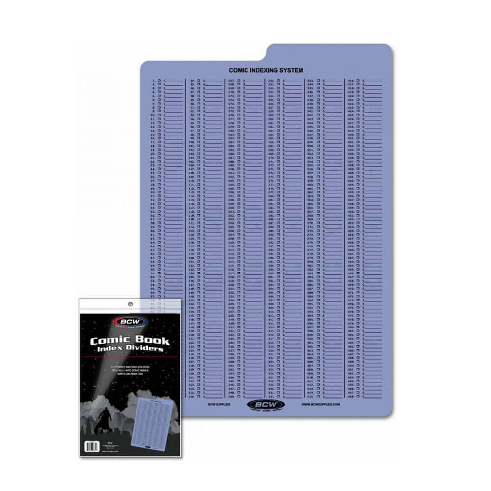 Die BCW-Comic-Index-Trennblätter bestehen aus hellblauem Polyethylen mit hoher Dichte (Archivqualität) mit 30 Punkten, mit beschreibbarem Index-Tab und sind präzise auf Größe zugeschnitten. Mit gedrucktem Comic Indexing System haken Sie die Ausgaben von 1 bis 498 ab und geben Sie den Ausgabepreis an.