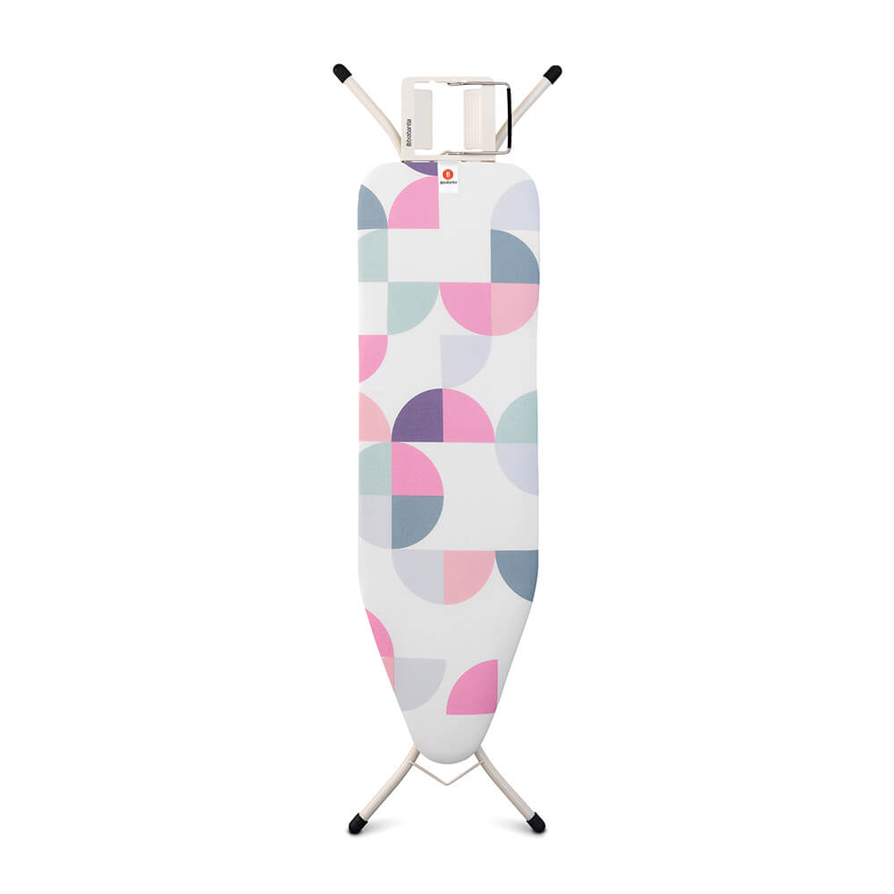 Breite Arbeitsplatte, die für alle gängigen Dampfbügeleisen geeignet ist. Ergonomisches Design, einstellbar auf 7 Höheneinstellungen (69 cm–96 cm).