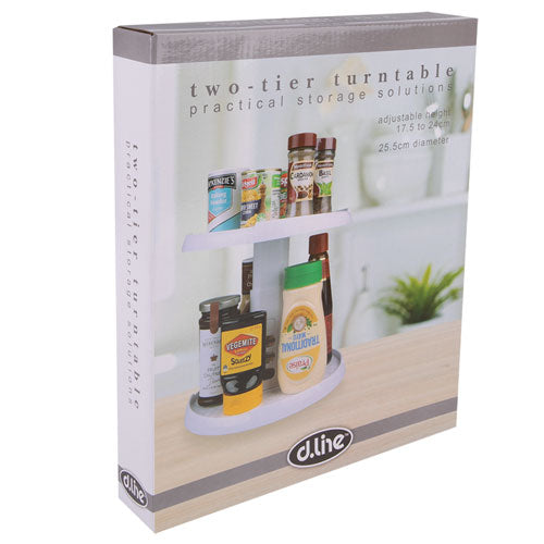Organisieren Sie Ihr Zuhause mit dem d.line Two-Tier Turntable. Die multifunktionale Aufbewahrungslösung spart nicht nur Platz, sondern nutzt auch ein um 360 Grad drehbares Kugellagerdesign, um mühelos an jeden Gegenstand zu gelangen, den Sie benötigen.