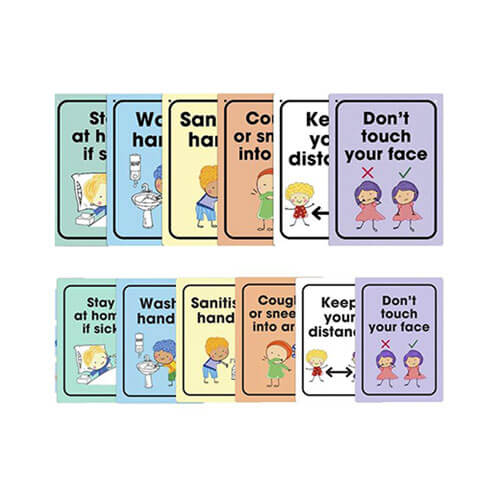 • Zu den Botschaften auf diesen Schildern gehören „Waschen Sie Ihre Hände“, „Hände desinfizieren“, „Halten Sie Abstand“ und mehr .