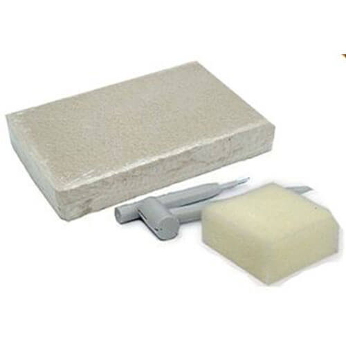 Das Kit enthält einen Gips-/Sandblock, ein Schabewerkzeug und eine Bürste.