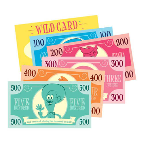 • WIE SPIELST DU? - Bei jeder Runde liest Spieler 1 eine der 180 lustigen, kreativen, persönlichen und "geladenen Fragen" vor. Alle anderen schreiben eine persönliche Antwort auf die Frage auf ihren Antwortbogen. Jede Antwort reicht! Der Spieler rechts von Spieler 1 sammelt, mischt und liest die Antworten vor. Spieler Eins wählt seine Lieblingsantwort aus und muss erraten, welcher Spieler welche Antwort gesagt hat. Spieler 1 sammelt für jede richtige Übereinstimmung eine Geldkarte. Der Spieler, der die Lieblingsantwort geschrieben hat, zieht auch eine Geldkarte. Jede Geldkarte hat einen Dollarwert von 100 bis 500 US-Dollar, und Joker werden eingemischt