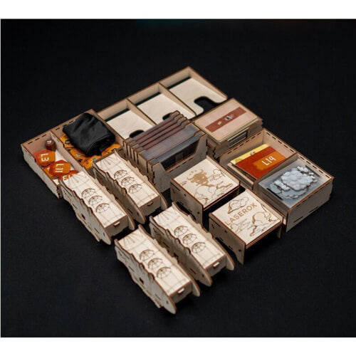 Um den Spielern dabei zu helfen, das Spiel in wenigen Minuten einzurichten, haben wir einen Organizer entworfen, der nicht nur nützlich, sondern auch optisch ansprechend ist. Bewahre deine Spielerkomponenten in einem Doppeldecker-Luftschiff auf und reise über die ausgetrocknete Landschaft von CloudAge.