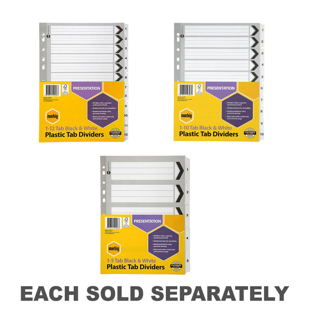 Diese verstärkten Tab-Trenner von Marbig verfügen über 5 leere Tabs, mit denen Sie Ihre Dateien einfach in Abschnitte organisieren können. Sie bestehen aus verstärktem Manilakarton mit Kunststofflaschen und Bindemittelstreifen für eine lange Lebensdauer. Es enthält eine Seite mit einem Inhaltsverzeichnis, sodass Sie genau schreiben können, was in den einzelnen Kategorien enthalten ist.