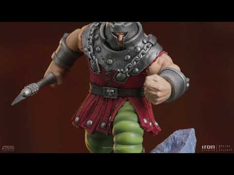Mit schweren Schritten zwischen den Felsen der Ebene auf Planet Eternia rennt ein kleiner und kräftiger Krieger mit seiner Streitaxt los, bereit, seine kräftigen Beine als Spulen zu nutzen, um seinen Kopf buchstäblich gegen seine Gegner zu stoßen. Mit seinem rustikalen, flachen Metallhelm, einer massiven Rüstung, die seinen Oberkörper bedeckt und mit Ketten an der Brust über einer roten Tunika befestigt ist, wird dieser furchtlose Heldenkrieger in der Statue „Ram-Man BDS – Masters of the Universe – Art“ präsentiert Maßstab 1/10" von Iron Studios.