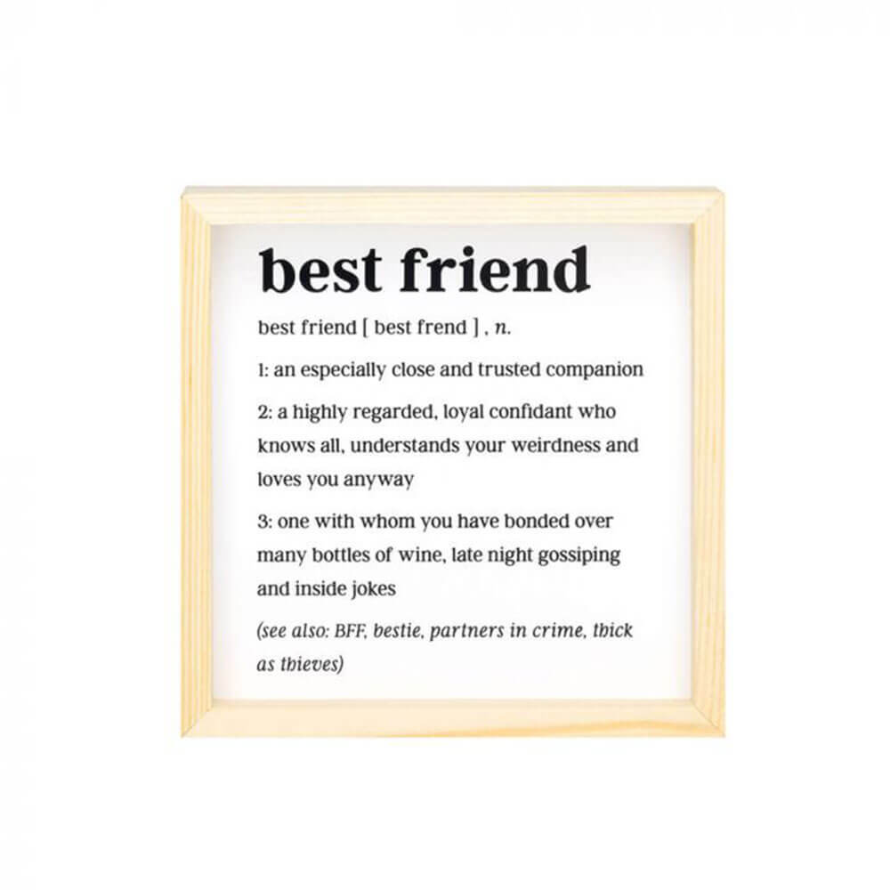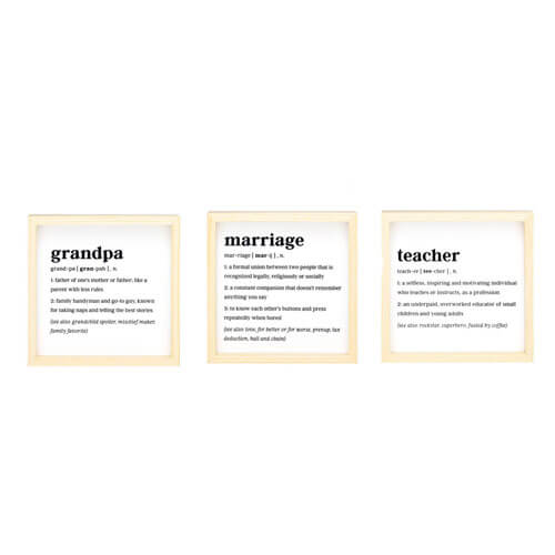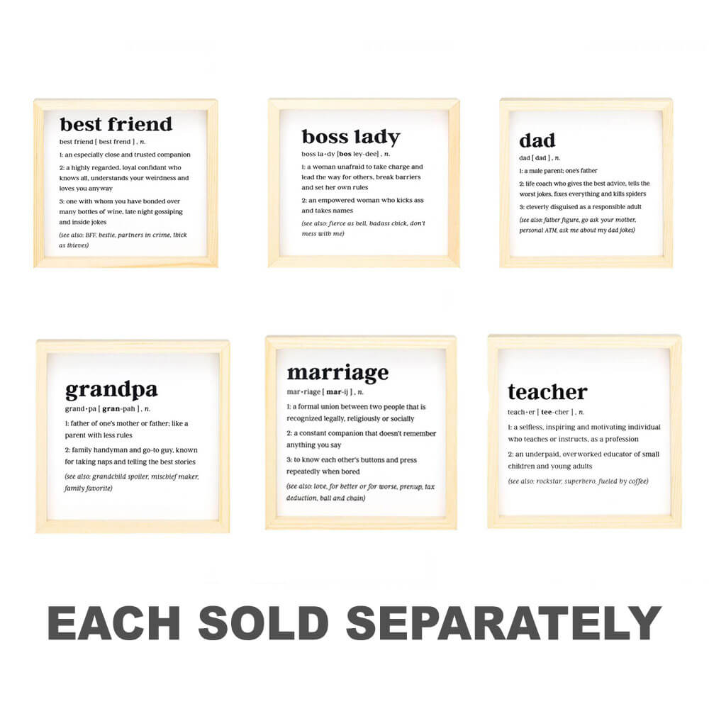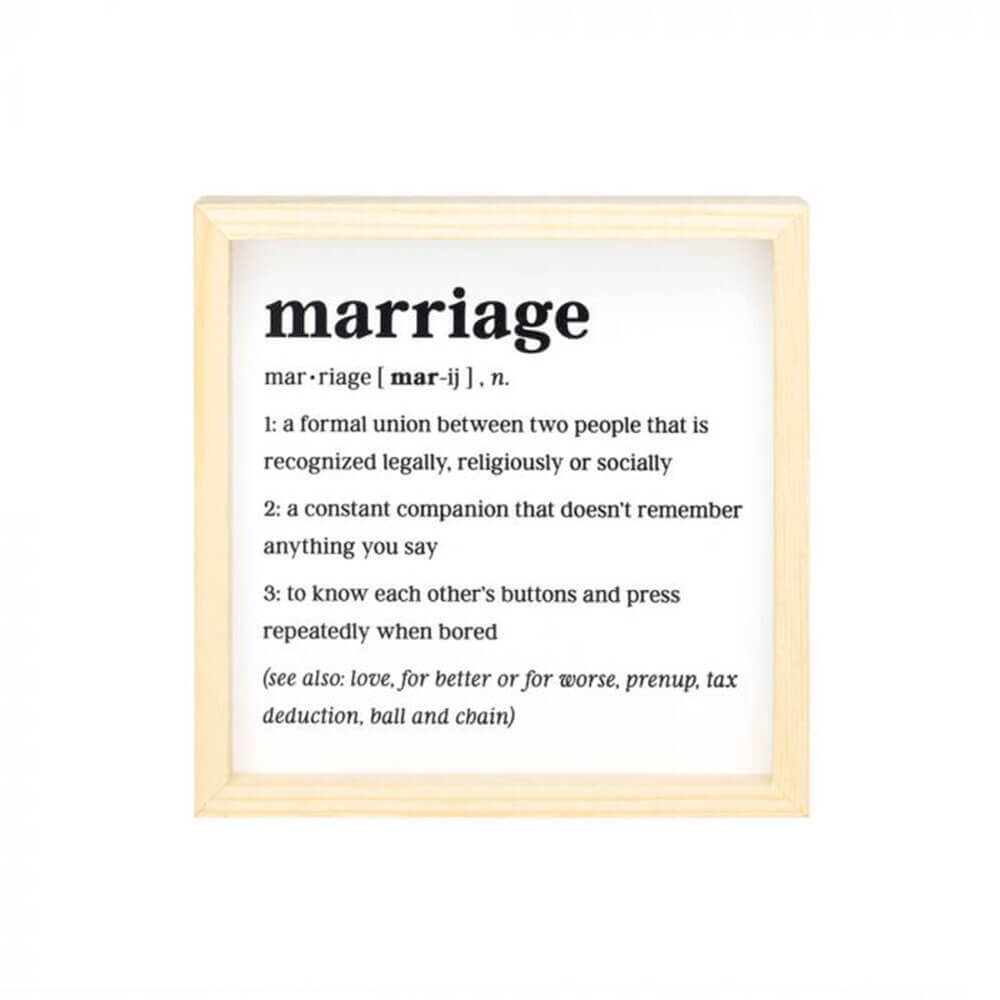 • Die Bildunterschrift auf der gerahmten Kunst ist eine witzige Interpretation einer originellen Definition von Ehe