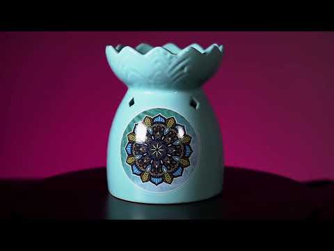 Beruhigender Ölbrenner mit Lotusschalen-Design. Verfügt über die 7 Chakra-Symbole, Blumenmuster und eine meditierende Silhouette. Geeignet für die Verwendung mit Duftölen, Wachsschmelzen und Teelichtern – reinigen Sie Ihren Raum! Nur Handwäsche – nicht spülmaschinenfest.