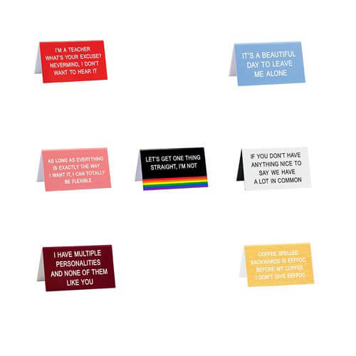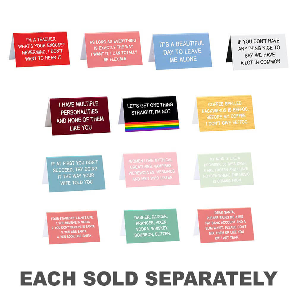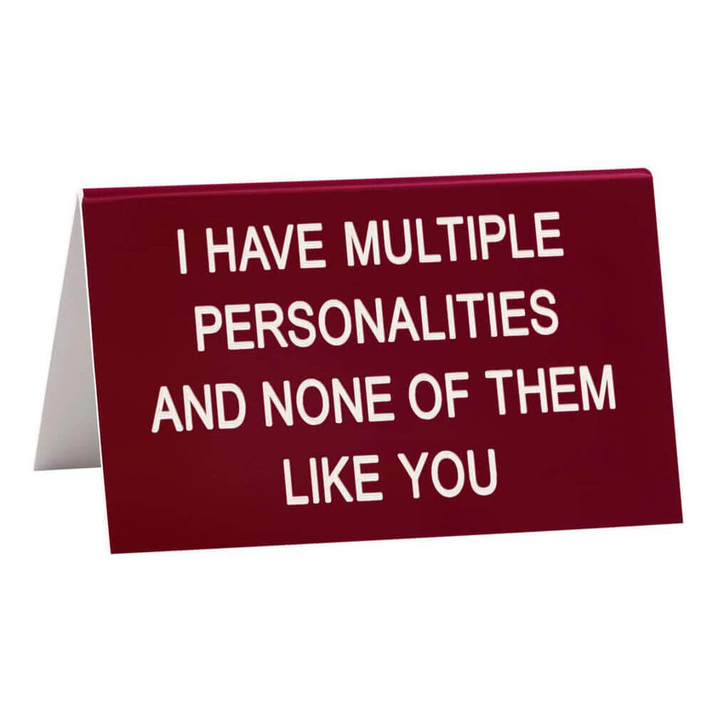 Brechen Sie die Monotonie der Arbeit auf und bringen Sie ein paar LOLs ins Büro mit diesem burgunderroten Schreibtischschild von SAY WHAT?. Die Bildunterschrift lautet: „Ich habe mehrere Persönlichkeiten und keine davon ist wie du.“ Das Produkt misst 11,5 cm x 7 cm.