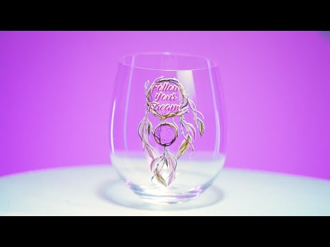 • Mundgeblasenes Weinglas ohne Stiel mit einem skurrilen Traumfänger „Follow Your Dreams“.