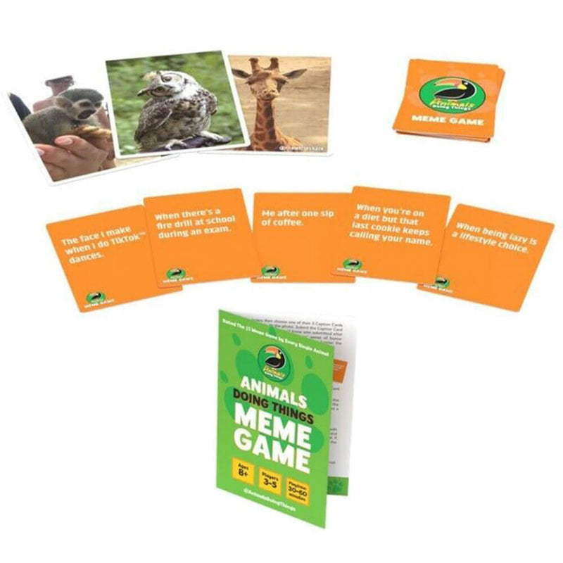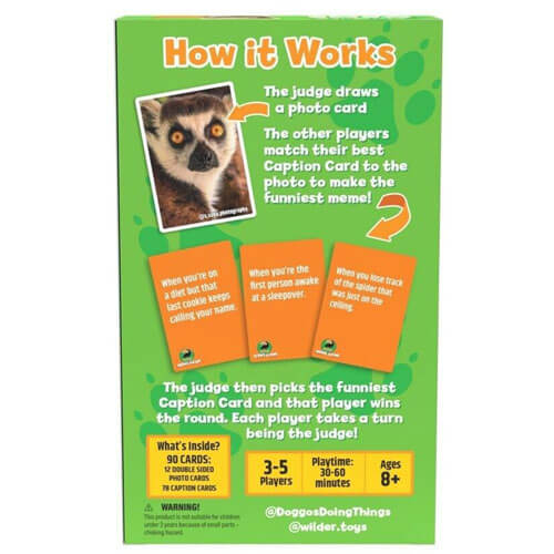 - Kommt mit lustigen doppelseitigen Fotokarten und der lustigsten Beschriftungskarte. Kombinieren Sie die Karten, um Memes zu erstellen, die den Richter zum Lachen bringen.