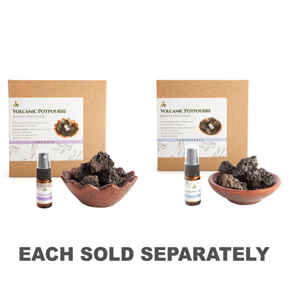 - Inklusive Terrakottaschale , Vulkansteine, schwarzer Kordelzugbeutel und ätherisches Lavendelöl.