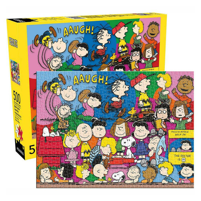 - Setzen Sie dieses 500-teilige Peanuts Cast-Puzzle mit den Favoriten aller zusammen; Snoopy Charlie Brown Woodstock und der Rest der Bande.