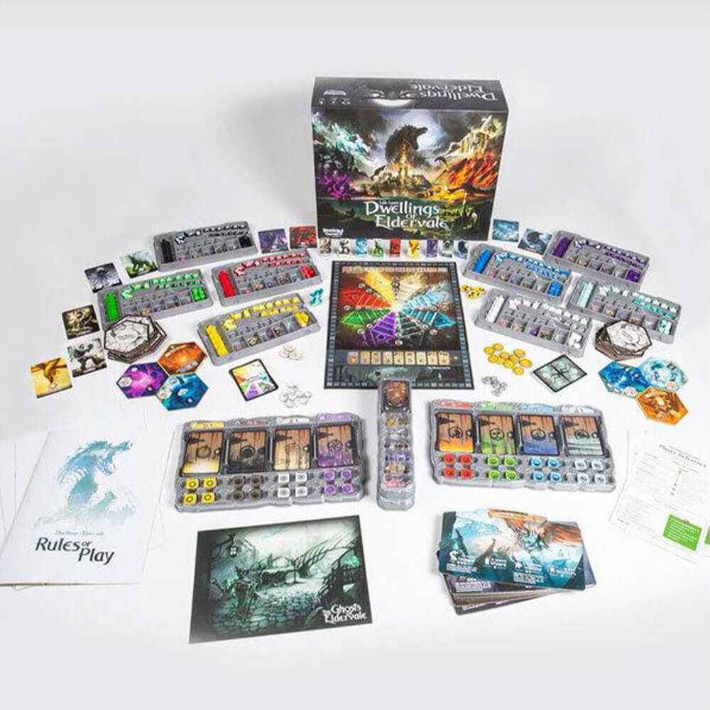 Dwellings of Eldervale ist ein episches Worker-Placement-Spiel, das in einer einst verlorenen magischen Welt spielt. Riesige Elementarmonster streifen umher, während Drachen, Zauberer und Krieger um die Vorherrschaft über 8 Elementarreiche kämpfen. Die Spieler kontrollieren einzigartige Fraktionen, die Abenteuer suchen, kämpfen, an Macht gewinnen und schließlich Eldervale bewohnen und es nach ihren Vorstellungen gestalten. Die Standard Edition enthält: 8 doppelseitige Spielermatten in benutzerdefinierten Gametrayz, 6 Dungeon-, Ressourcen-, Hex-, Core-Gametrayz, 72 benutzerdefinierte Meeples, 8 Spielerfarben, 48 benutzerdefinierte Meeple-Unterkünfte, 8 Spielerfarben, 48 hölzerne Punktemarker, 8 Spielerfarben, 53 marmorierte D6-Würfel, 8 Spieler-/Monsterfarben, 1 Elementar-Anzeigetafel und Unterwelt, 32 einzigartige Elementar- und Ruinen-Hex-Kacheln, 24 Ghosts of Eldervale Solo-Modus-Karten, 1 Ghosts of Eldervale-Spielmatte und Watcher Meeple, 60 Zauberkarten, 104 Abenteuerkarten, mit einzigartiger Fantasy-Kunst, 8 Fraktionskarten für Anfänger, 9 Monsterkarten, benutzerdefinierten Illustrationen/Fähigkeiten, 9 Monsteraufstellern und 12 Plastikständern, 9 Glasperlen-"Kugeln", 120 Kartonressourcen, 10 Karton-Taktik- und Schatzmarken, 5 Spieler-Referenzhilfen , und Anhangheft.